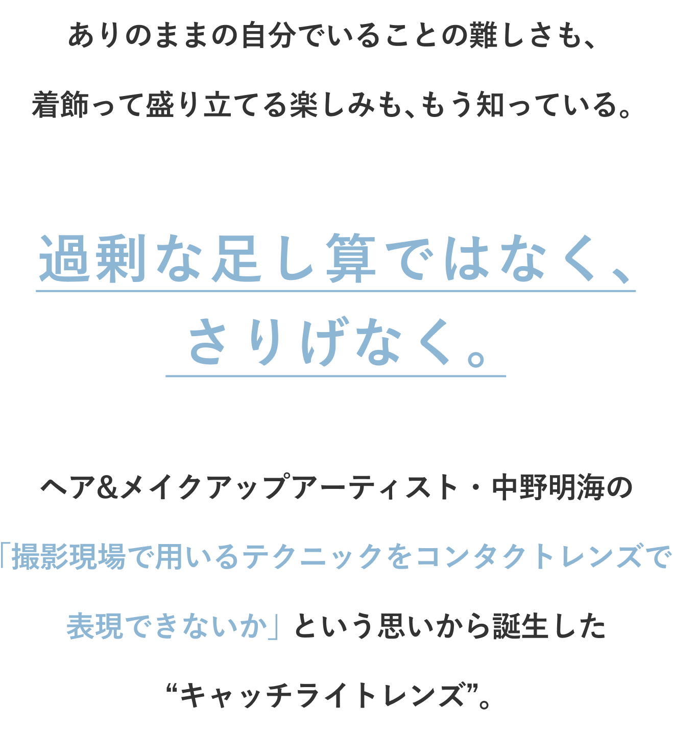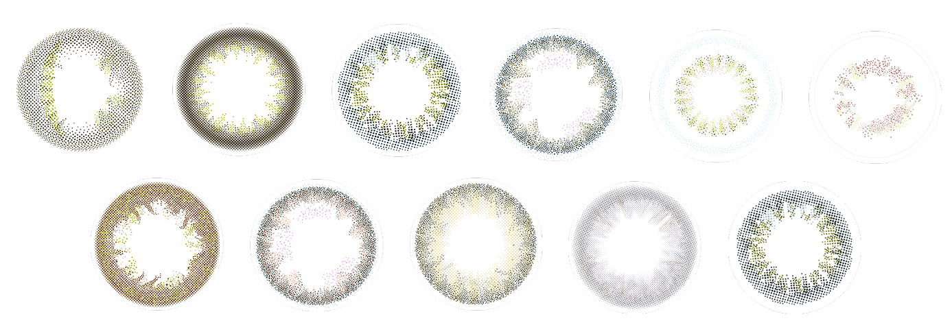 ヘア&メイクアップアーティスト・中野明海の「撮影現場で用いるテクニックをコンタクトレンズで表現できないか」という思いから誕生した“キャッチライトレンズ”。 “キャッチライト”とは、レフ板を使って被写体の瞳の中に写り込ませる光のこと。黒目を大きく、瞳を色付けることを目的とした従来のカラーコンタクトレンズとは異なる発想で、瞳の中でキラキラと輝く光を表現し、透明感と潤いに溢れた瞳を実現。繊細な色合いとそれを左右非対称に配したデザインによって、柔らかく朗らかな印象を自然に演出します。